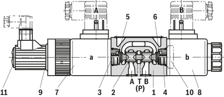 在非致動狀態(tài)下,控制滑塊 (2) 被磁鐵的復位彈簧保持在機械中心位置。對于控制閥芯符號“V”,這與液壓中心位置不符!當電動閥控制回路關閉時,控制滑塊位于液壓中心位置。